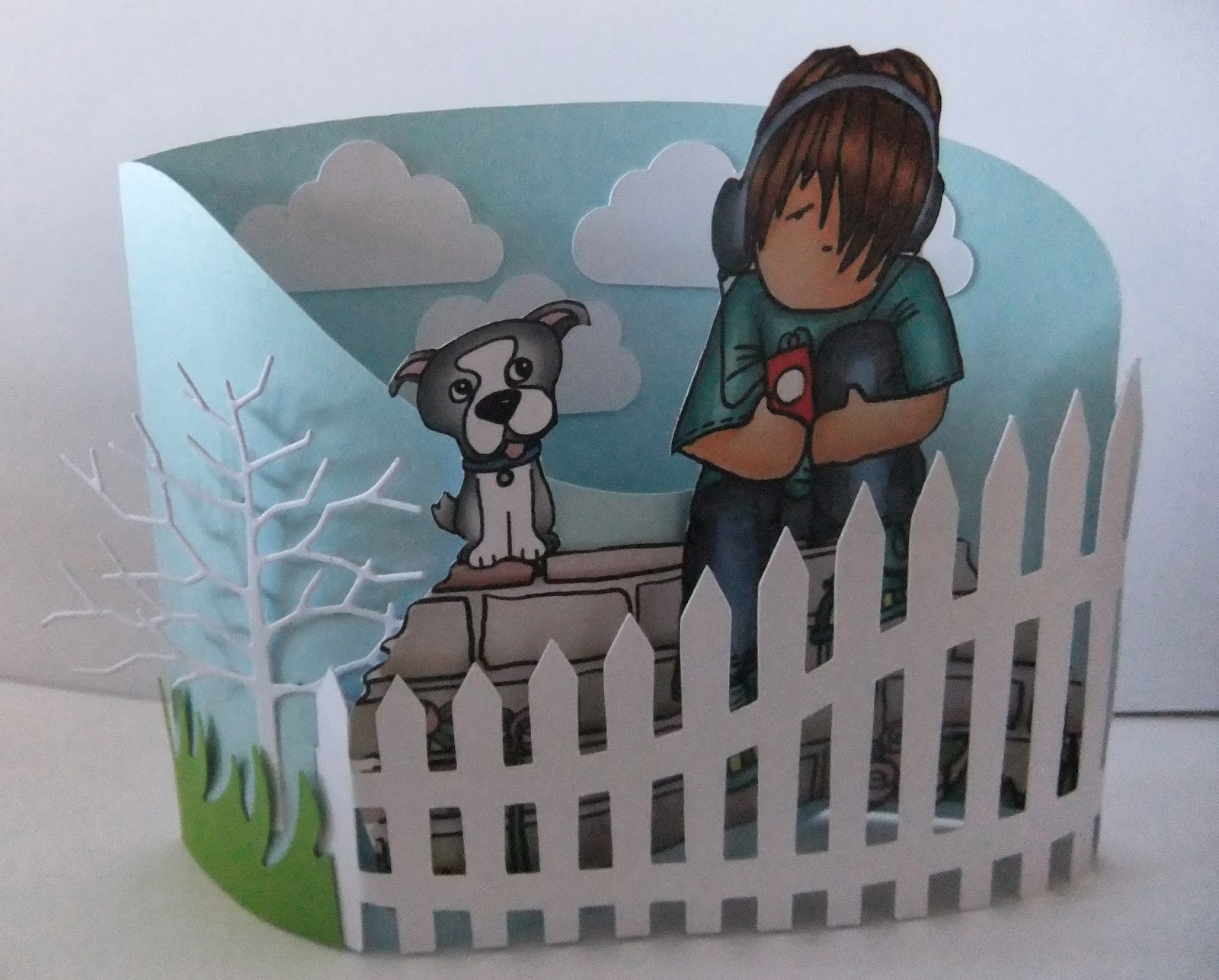 Scatty Jan Oh what fun I had making this bendy card , This is a first for me and I can see myself making plenty more . They lay flat to send too which is a bonus. I cut the card on my portrait - The tree and grass are dies. I used the Pretty Tuff CD - the boy, dog and wall all from the CD - The boy Kevin is also available as a stand alone digi - just perfect for teenage cards. I used Graph'it Markers to colour xx