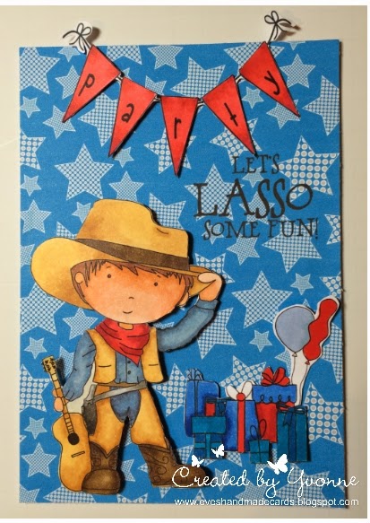 Yvonne - Hello there!! Well this week I had a complete blast! Make something for a kids party; well it has to be the invites, and what better little character to use for birthday invites than Cowboy off of Work and Play Collection 3 which is now available to download through Polkadoodles Digiworld Downloadables or as a CD-Rom. I adore him and he comes with his own fab papers too, one of which is what I used for the backing paper. Cowboy also has his own sentiments and I took the sentiment into craft artist along with the paper and printed them out as one. I also used embellishments from Digistamp Heaven CD-Rom, for the gifts and bunting (there has to be bunting on invites, it's the law). All coloured with my Graph'It Markers which are simply fabulous and there you have a nice wee A6 Birthday Invite! Yee-hah!