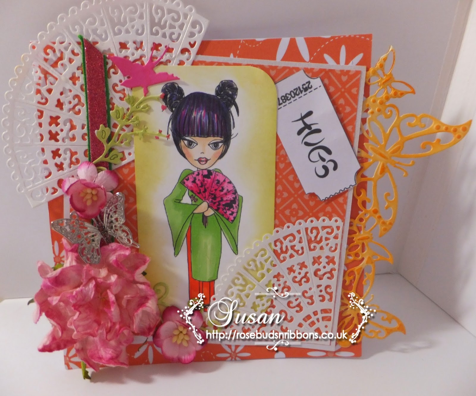 Susan : For my card this week I have used Papers from Girls Hoot I just love the bright papers in this collection and for my digi I have chosen an image from Dollie Daydreams goes East and coloured her with my Graph'it markers list I have used can be found on my blog, The dies are by Tattered Lace and the embellishment's are from my Stash.