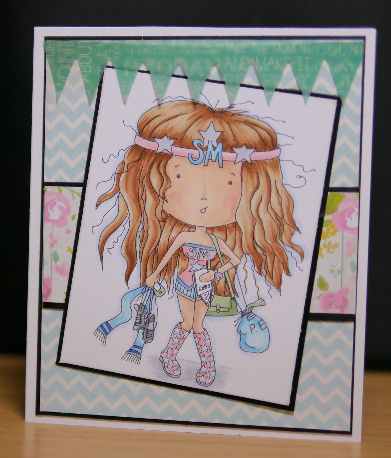 Jo- I have chosen one of the gorgeous digis that were recently released as part of the Polkadoodles birthday celebrations, I used one from the Ruth bundle. I think this is such a fab image and have wanted to colour it for ages. I picked some colours from the Kaisercraft papers I used to colour my image in with so it all co-ordinated and added some vellum bunting to embellish it.