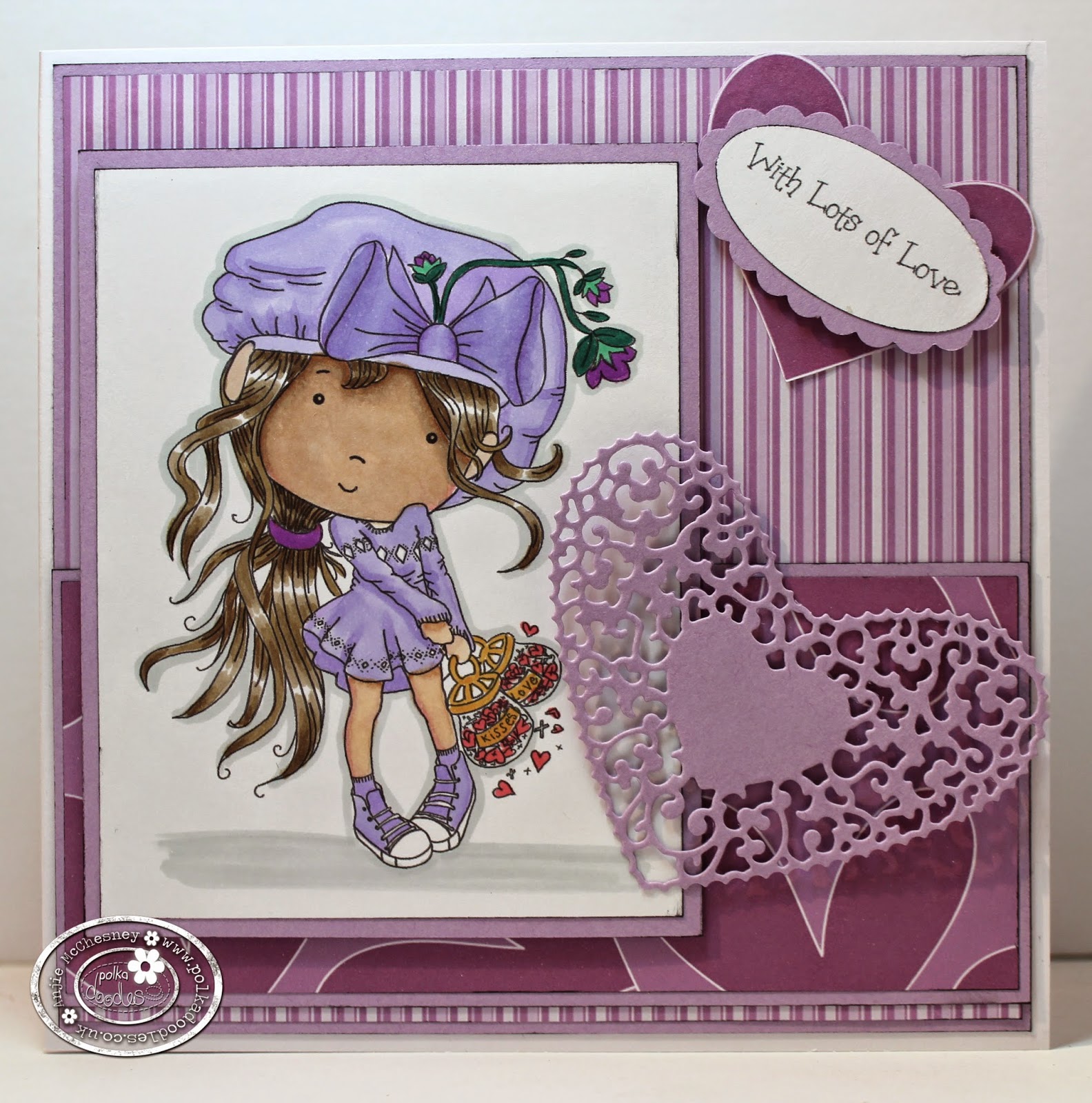 Anjie - I have used the Love & Kisses image and papers from the new Work & Play collection, number 9 Love & Romance. It is not available as a download just yet but will be soon so I wanted to show you a little bit of what to expect. I have coloured her with my Graph'It Markers.