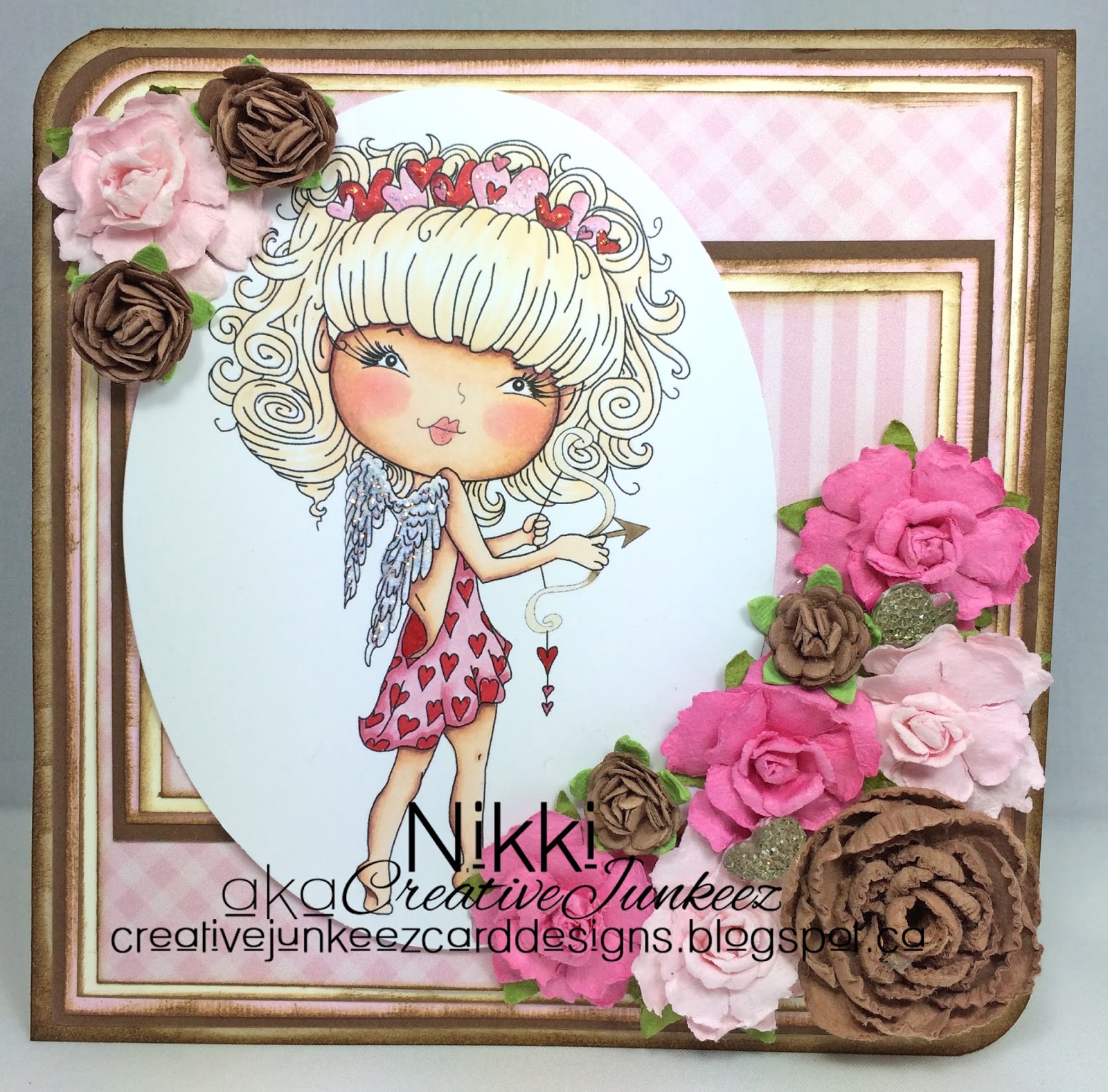 Nikki - Pink has been one of my favorite colours as of late so doing anything in pink is fun.... The new release, Work and Play Collection 9 is to DIE FOR...... I chose a sweet little image called Cupid's Arrow. If you are just after the image you can find it here! BUT, I am telling you..... GET THE WHOLE CD..... the papers that I used are also on it and the whole CD is AMAZING.... Of course I inked her up with Copic markers...... check out my blog for all the details.....