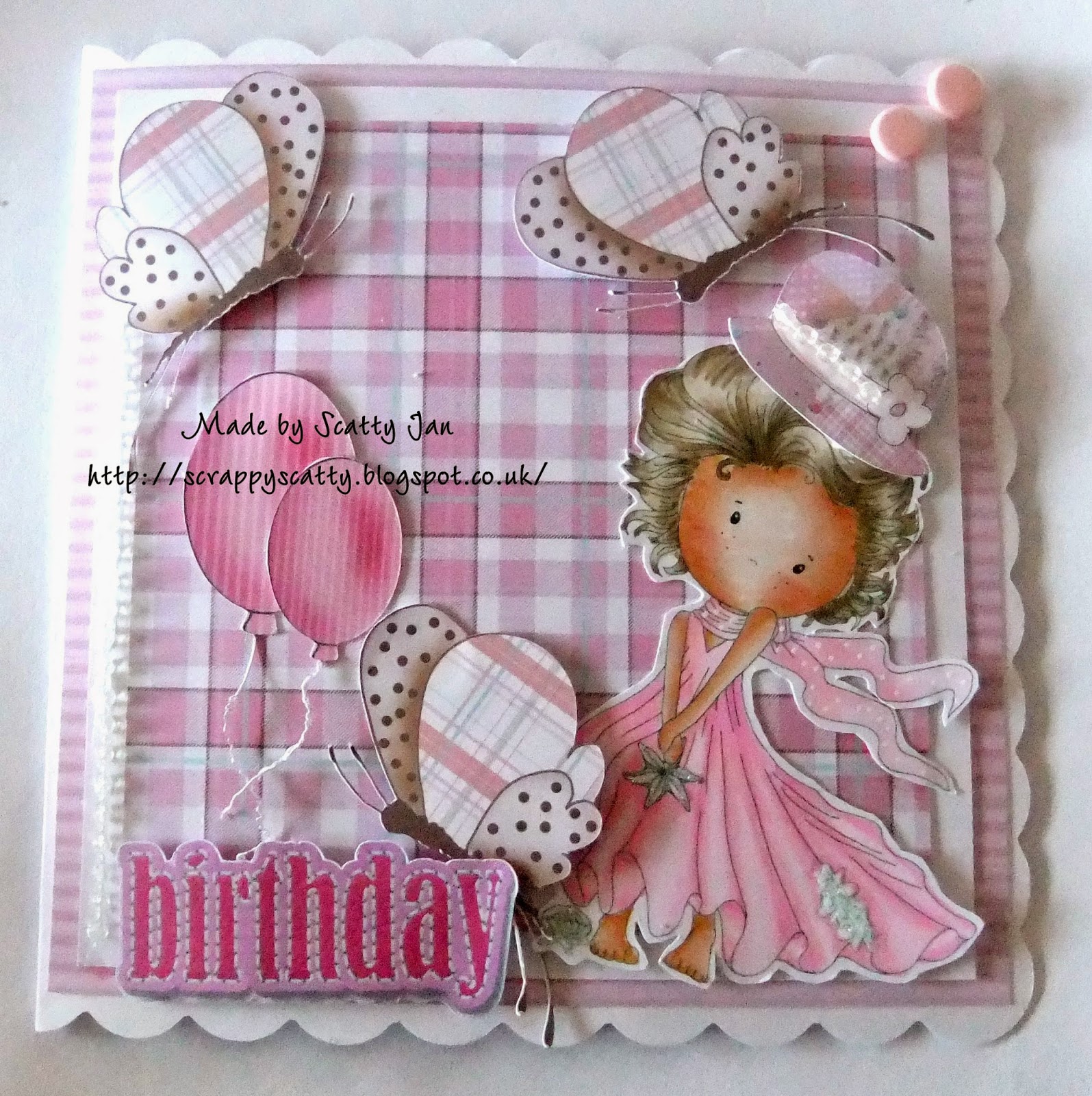 Scatty Jan - This week I have used the lovely digi Shannon you can find her here. Her hat , butterflies, balloons, papers and sentiment were all from The Winston collection available on a CD or an instant download. I coloured Shannon with Graph'It markers and also used Graph'It white shake it to add some detail to her scarf. Added a trim to side of card and her hat , a couple of card candi and a sprinkling of glamour dust.