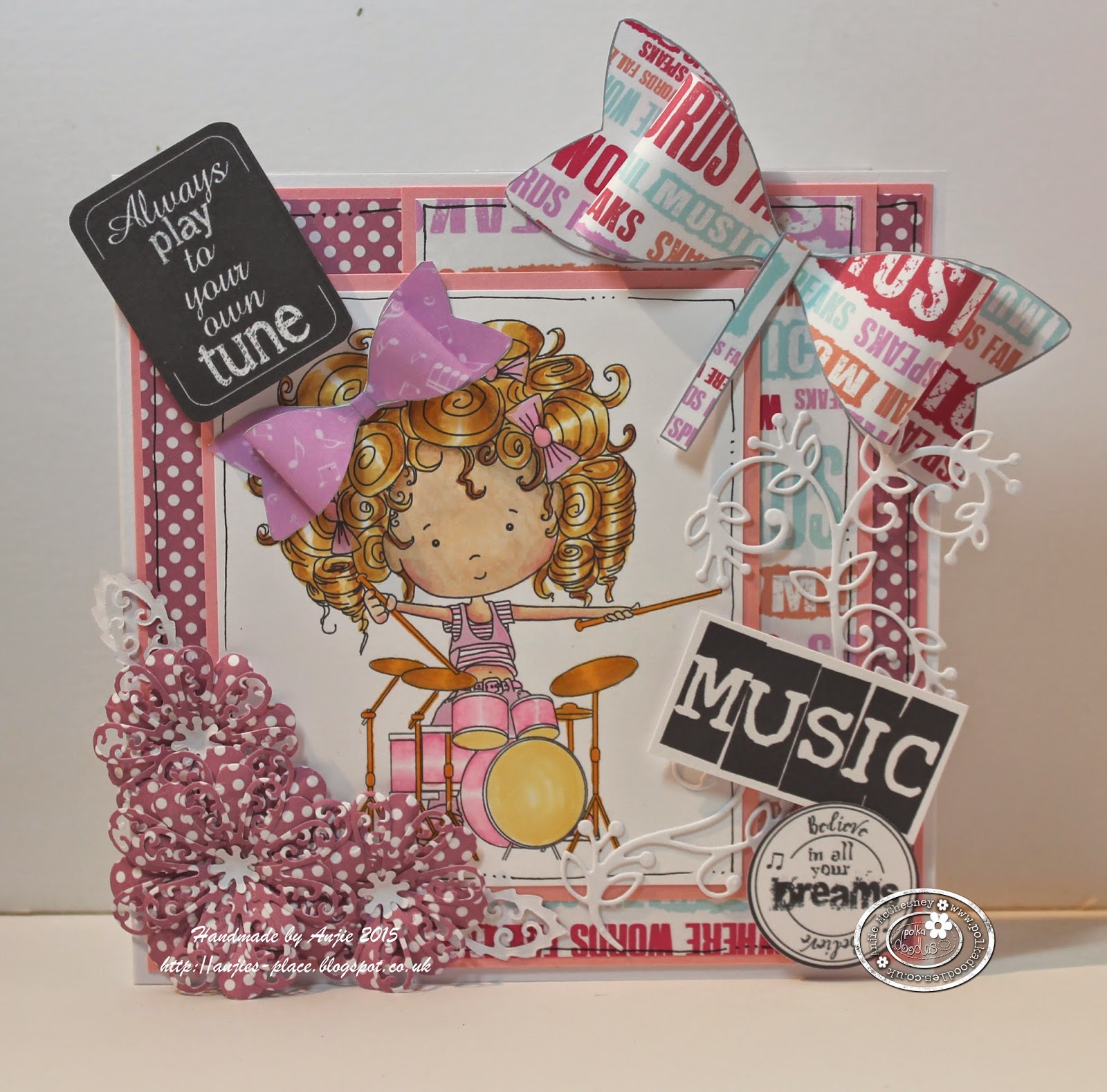 Anjie - The image is the adorable drummer girl and coloured her with my Graph'It Markers. She reminds me so much of our Poppy when she was little as she had a little drum kit that she absolutely adored! The papers are from the Opera themed collection. The embellishents, bow and sentiments are from the full Work & Play 8 collection download. This is also available as a CD as well.
