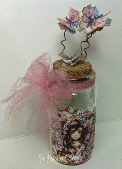 Monica-When you give the chance to do "anything", I'll take your word and get the chance to try out new things. For this week project, I´m using the gorgeous Eden Collection precoloured images, over printable waterproof vinyl. I printed out the lovely precoloured Eden Butterflies image, and added some butterflies, a tag and a sentiment, all included in the Eden Collection. To cut the vinyl I used "print and cut" feature from my Cameo. And finally applied everything to the glass bottle with transfer paper.