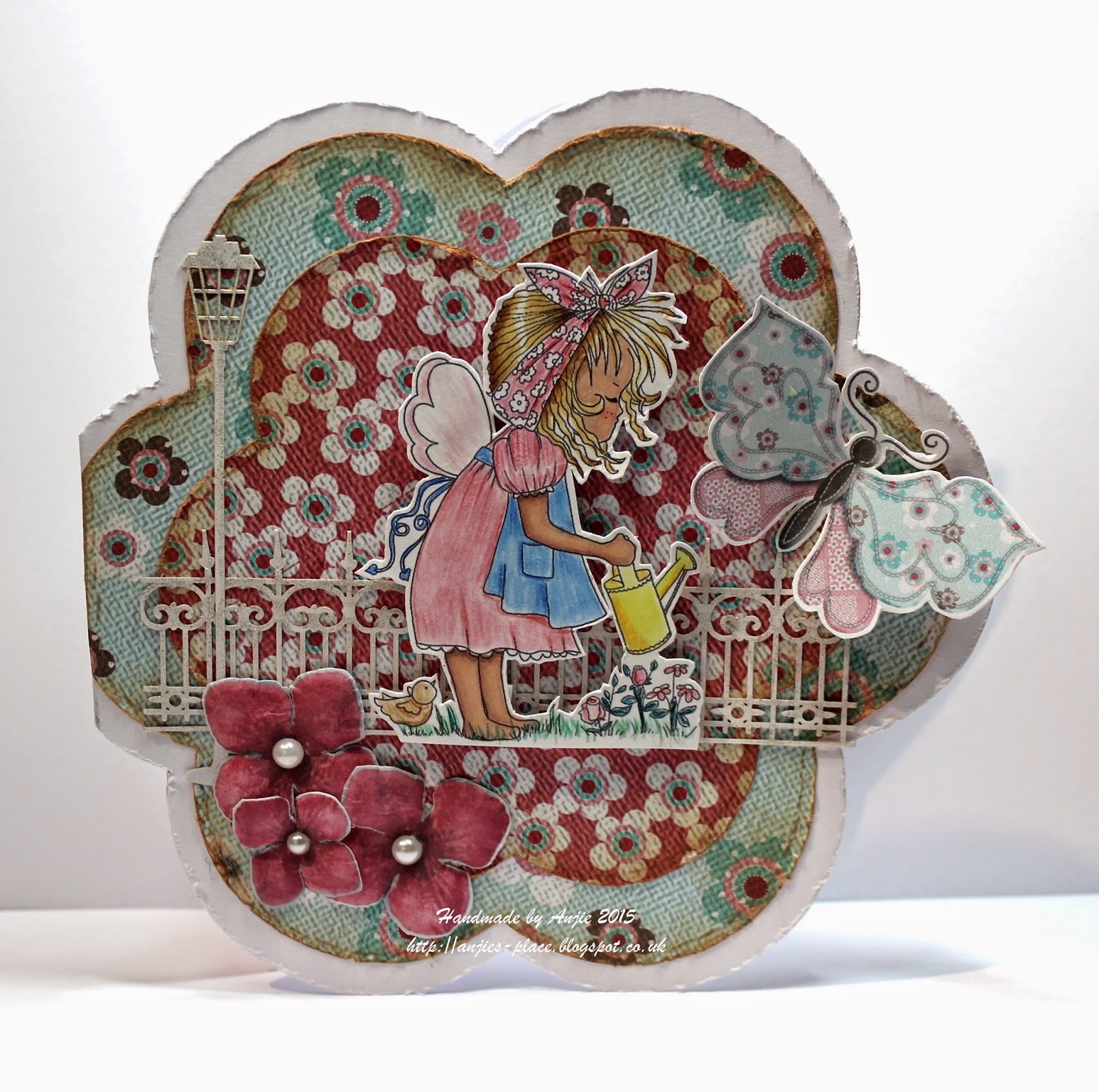 Anjie - To create the shape of the card I have used the Flower shape art 6 from Dutch Doobadoo. The image I have used for this is from the cute Sugarplum Daisy CD, and the papers are from the Octavia Moonfly download, as are the flowers and the butterfly. The fence and lamp post are laser art from Dutch Doobadoo. I coloured the image in with some cheap pencils that I picked up while I was in Egypt.