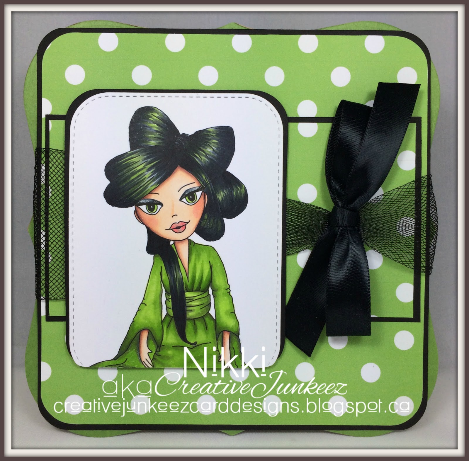 Nikki - I do not make many cards that are not square shaped, but I do like doing it every so often.... I used the Grand Caliber Labels 1 for the background shape, it is hard to see but I swear it is there...... The image I used.... (my first Dollie Daydream!) She is gorgeous! I loved inking her up with my Copics..... She can be bought as a single digital or you can get her with the Dollie Daydream Goes East collection. Oddly enough, I used paper from the Christmas Joy collection..... It was that certain green I was looking for.........