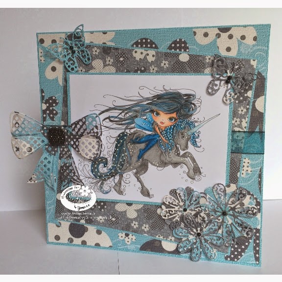 Yvonne - Hello there everyone! Well I decided for my challenge this week, I would tackle Octavia Moonfly because she is gorgeous and I haven't coloured her before. She is available as a separate digi image or as part of the collection, which you can get as a digi download or as a CD-Rom. I have coloured her with my polychromos pencils and used papers from the collection also. I die cut some flowers and butterflies as embellishments from the same papers. I then used a die bow to complete the challenge.