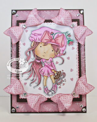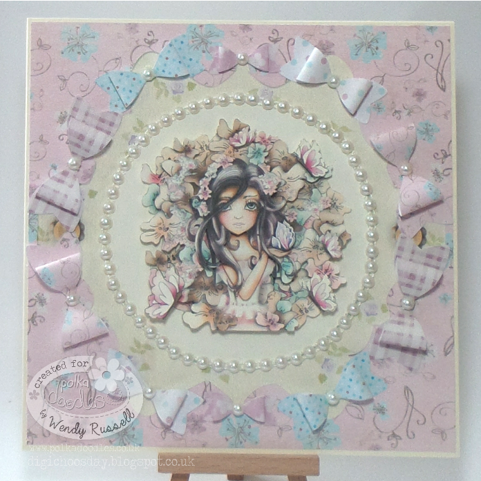 Scatty Jan This week I have used the lovely Maddie twirling curls digi stamp you can find her here, is'nt she a cutie! Loved colouring her , this time I coloured using Polychromos. The backing papers used are from the Cherryblossom Lane CD collection. I have cut the bow and punched some flowers out using the papers too . Adding some gems to finish.
