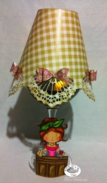 Monica I used the beautiful papers and the gorgeous bows included in Work & Play 9.-Love and Kisses and the lovely Landlady/barmaid, to make a wineglass lampshade.