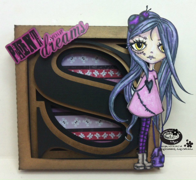 Monica - I think that Kraft is perfect for a "grunge creepy" look, so I made a shadow box card for my daughter "Sofia" that love that kind of stuff. Odella with bag was just the perfect adorable zombie for my project. She looks grunge because she has been buried for a while :o) Background paper and the lovely sentiment are from Work & Play 11.