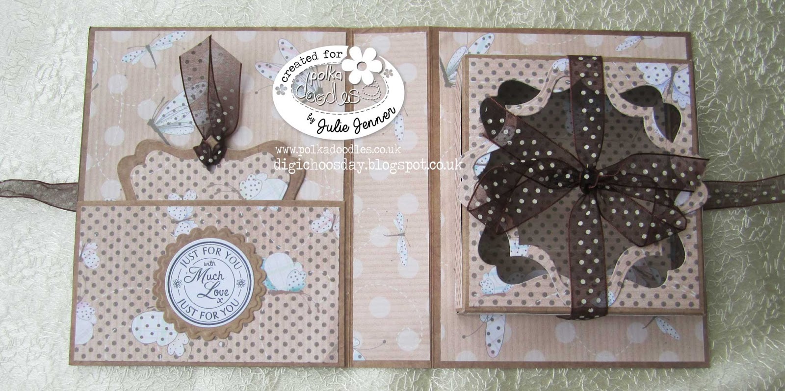 Julie - I made a Gift box card for our challenge using Kraft card for my base card and box inside and used the fabulous Winston Full Download collection from Polkadoodles for the wonderful image which is called Splish Splash and the beautiful patterned kraft papers, which are also available on the Winston CD. The outline image is available singly in the Polkadoodles store HERE