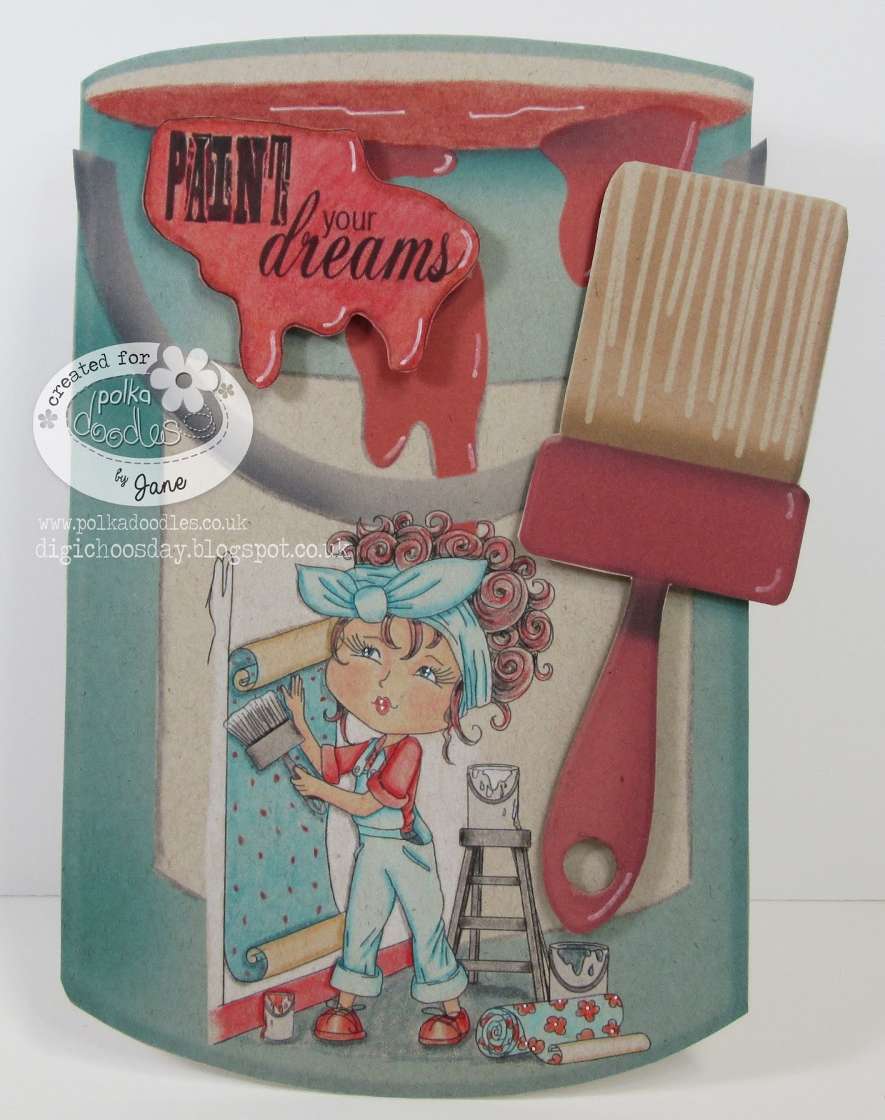pre-coloured paint pot image from one of Nikky’s newest collections WORK AND PLAY 11 and enlarged it in Serif. I then matted the digi stamp FEMALE PAINTER/DECORATOR on top of