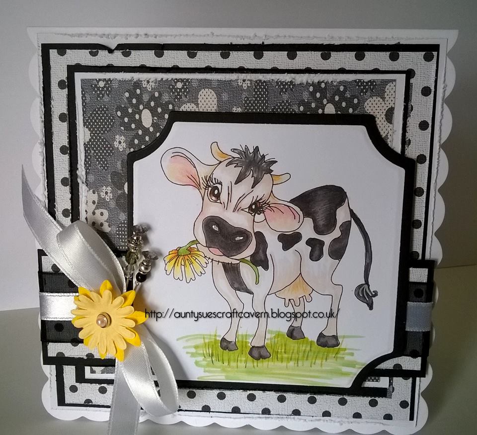 Aunty Sue - As soon as I saw the challenge I knew I had to use this fabulous Cow digital image. Available from the shop here along with the Black and white papers from Octavia Moonfly available here Image coloured with promarkers and edges of papers distressed.