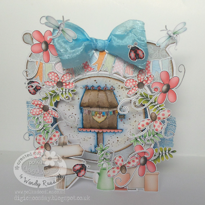 Wendy - For this weeks card, I've used the clock cutting file as the base card and just cut an extra hole through the centre to give an aperture. The birdhouse image is one of the digistamps from the Picnix - In the Garden collection, as are all the flowers, sign, flower pots and bugs, as well as the backing paper. You can also get this collection as part of the complete Picnix 1 and is combined with two other kits.
