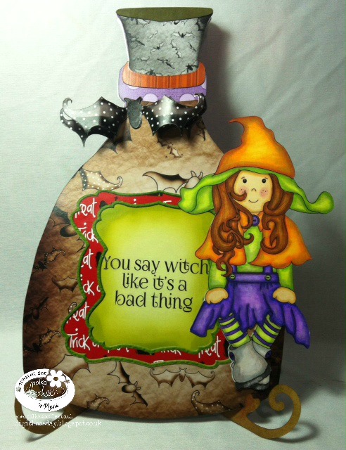 Monica.-For my sentimental make, I used a bunch of different products: papers from Halloween/Autumn Paper Heaven 1 and Halloween/Autumn Paper Heaven 2; the adorable sentiment and the potion bottle from Spooky Sentiments; and the lovely witch, tag and bat from Sundae of Seasons.