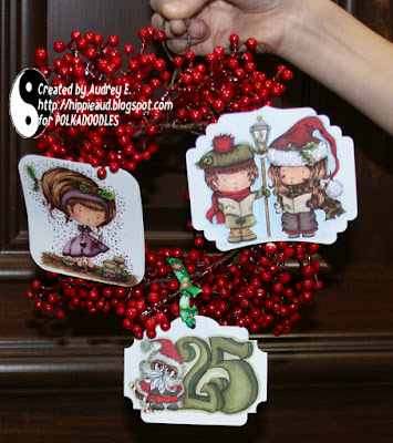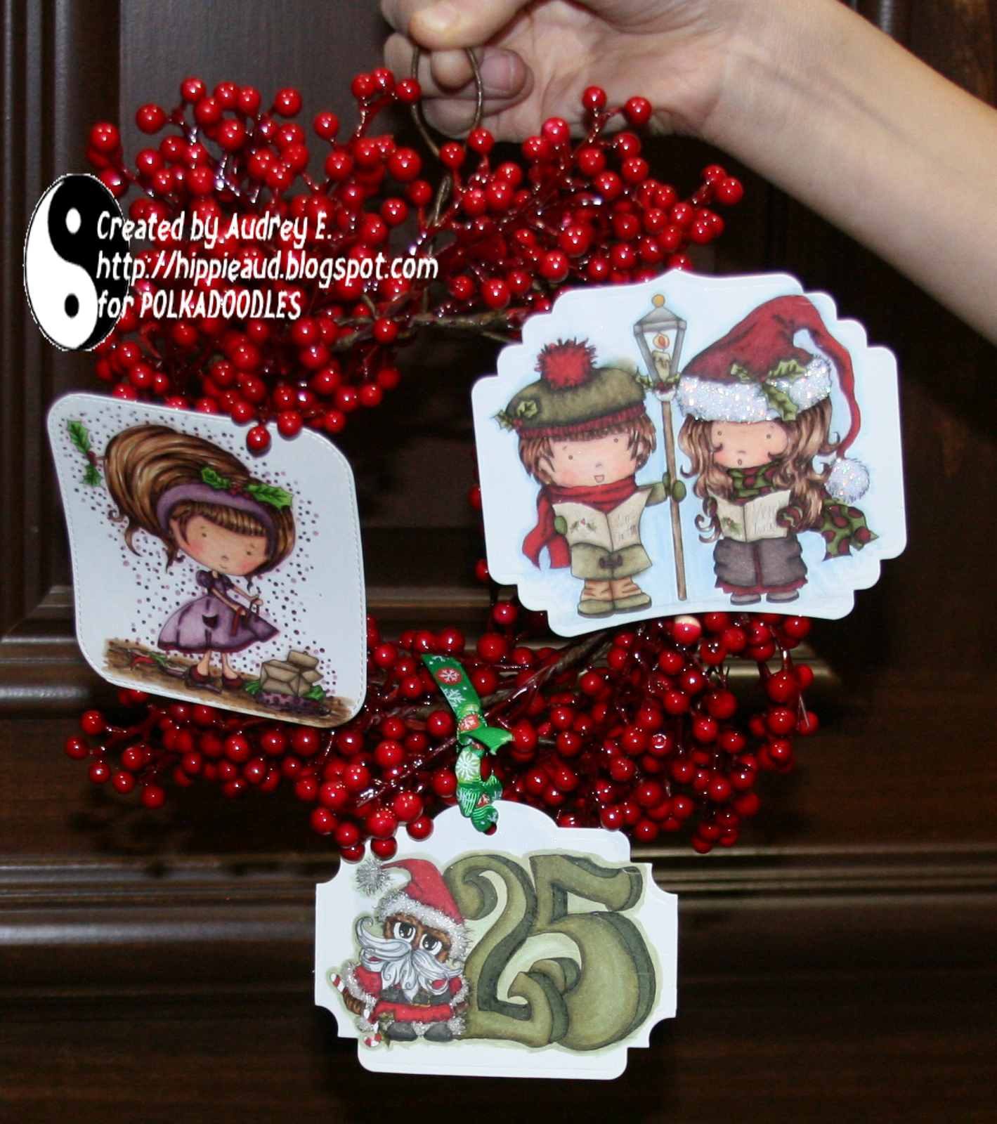 Audrey - last week I showed you all the things you could do with different elements from one Polkadoodles CD. This week, I decided to focus on coloring the gorgeous images from Polkadoodles, so I chose 3 different images and then added them to some garland I bought from Target that I twisted up into a wreath. At the bottom of the wreath, you will find Happy Christmas Twiggy and Toots which is also available in the Twiggy and Toots Festive Fun Downloadable Collection. The image on the right is Hollybobs Choir digi and the one on the left is Hollybobs Presents, both images can also be found on Work and Play Volume 5 Festive Hollybobs Download Collection. All images are colored with Copics and I added Stickles to the Twiggy and Toots image as well as the Hollybobs Choir digi. Sure hope you like it and Happy Holidays to all!!