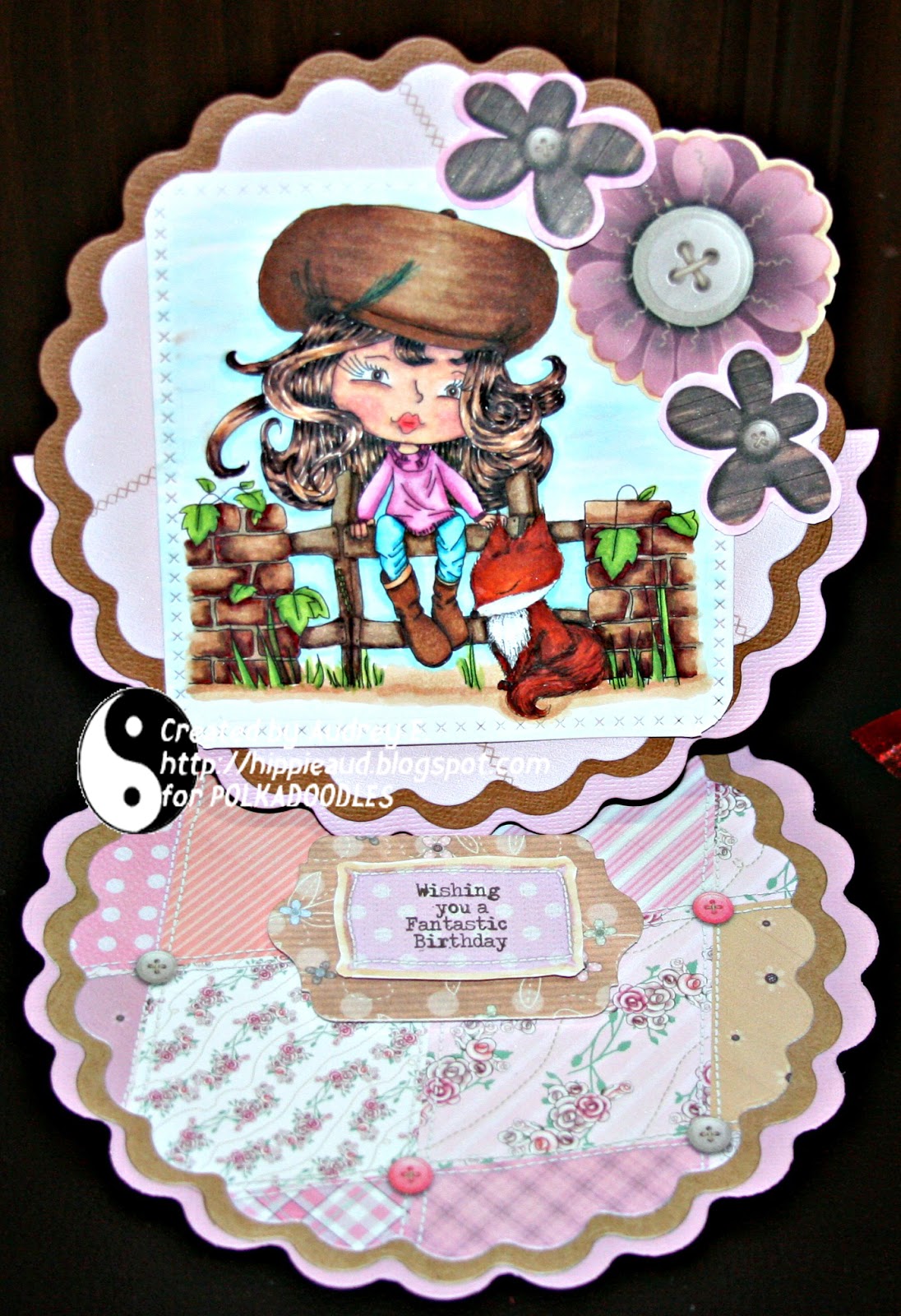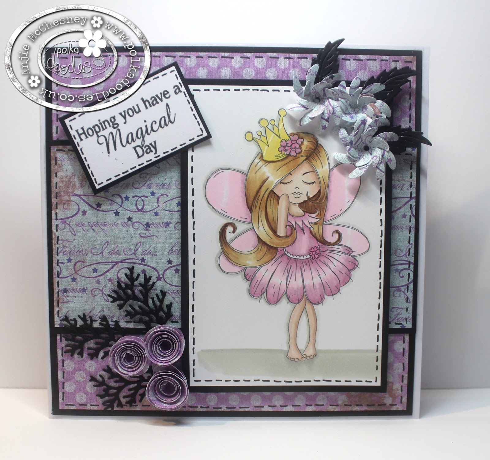 Anjie - I have used an image, a sentiment and papers all from the beautiful Serentity download collection. I have added faux stitching around the papers and the image for the challenge. I coloured the beautiful image with my Graph'It Markers. I made some rolled roses from the papers and added some die cuts to finish off the card. More photos and details on my blog.