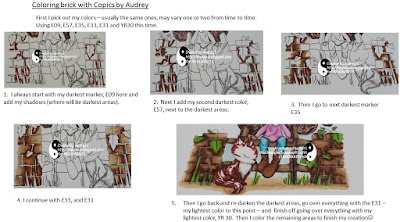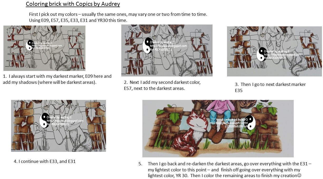 Audrey chose to use another gorgeous image from Work and Play Volume 10 Full Download Collection, this time working with Foxy Friend Digital Stamp. I have also included a tutorial on brick coloring with Copics for you. I hope you find it helpful and inspiring. I used a stitched die to cut out the image and all my papers from Winston Deluxe Full Collection download have stitching on them. My sentiment choice, cut out with scissors, also from Winston Deluxe Full Collection download, includes stitching as well. I chose flowers from Winston Deluxe Full Collection download and cut those with scissors after outlining with Copics.
