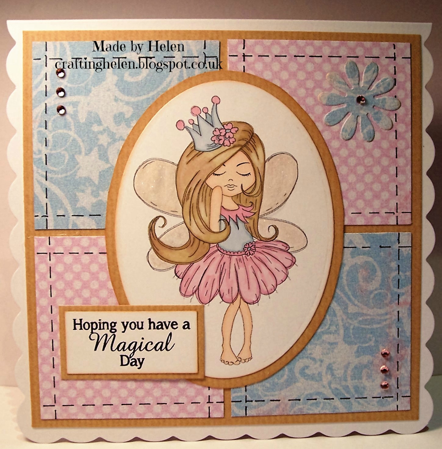 Helen - faux stitching is one of those things that I keep meaning to add to my cards but always seems to forget about! I've gone for a patchwork card layout with faux stitching round the edge of each of the blocks. The digi, paper and sentiment I've used are all from the 'Serenity Fairy Wishes' download collection available here.