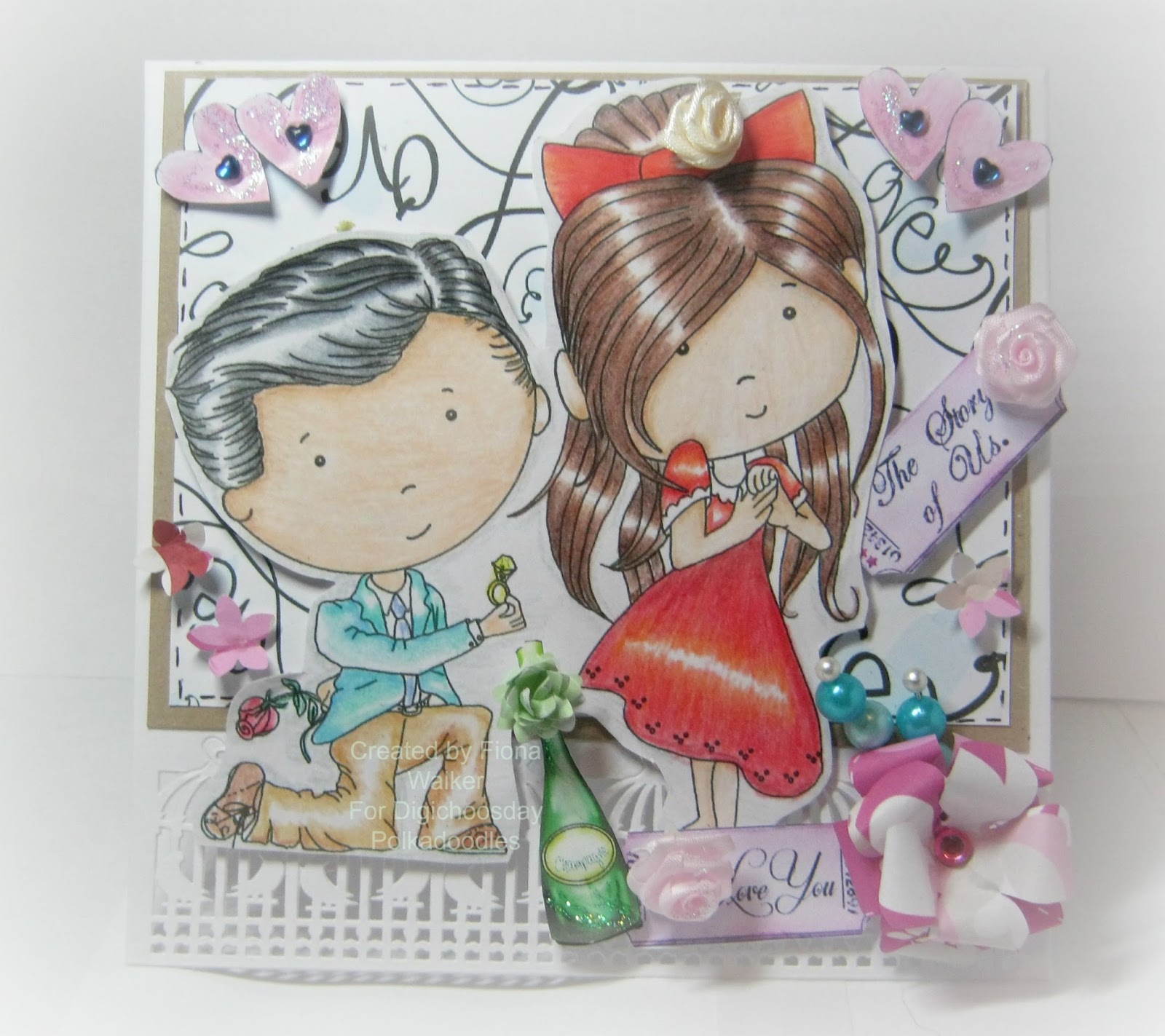Fiona - For this weeks challenge I have used a image from the work and play 9 love and kisses cd the image is called The proposal. the backing papers and embellishments are from the cd the large pink flower was created with papers found on the cd