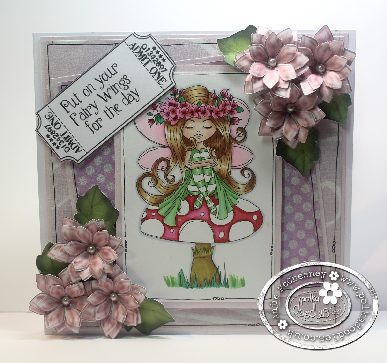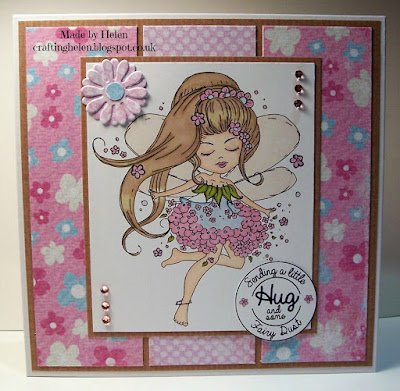 Helen - I thought the 'Serenity Fairy Wishes' bundle was perfect for this challenge. You can find it here on the Polkadoodles website. I chose a digi stamp called 'Serenity Dancing' which is also available here individually. She has flowers on the skirt of her dress and in her hair and I picked background paper from the download to match. I also used some polka dot paper from the download and used the same paper to die cut a flower. The circular sentiment is also from the download.