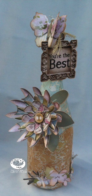 Monica- For my Mother´s Day make, I altered a bottle mixing two different papers from Eden Collection, then used a huge flower as a focal point and finally added some elements, all included in this collection.