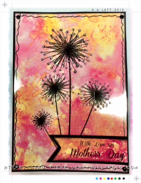 Gail - For my Mothers Day challenge project, I created a card using the brand new Winnie Sugar Sprinkles collection from Polkadoodles. I got out a fav medium of mine, Brushos, to create a bold & bright background for the gorgeous floral image from the Winnie collection. It's a a fairly simple make, printing the flowers onto acetate and then attaching it to the Brusho background.