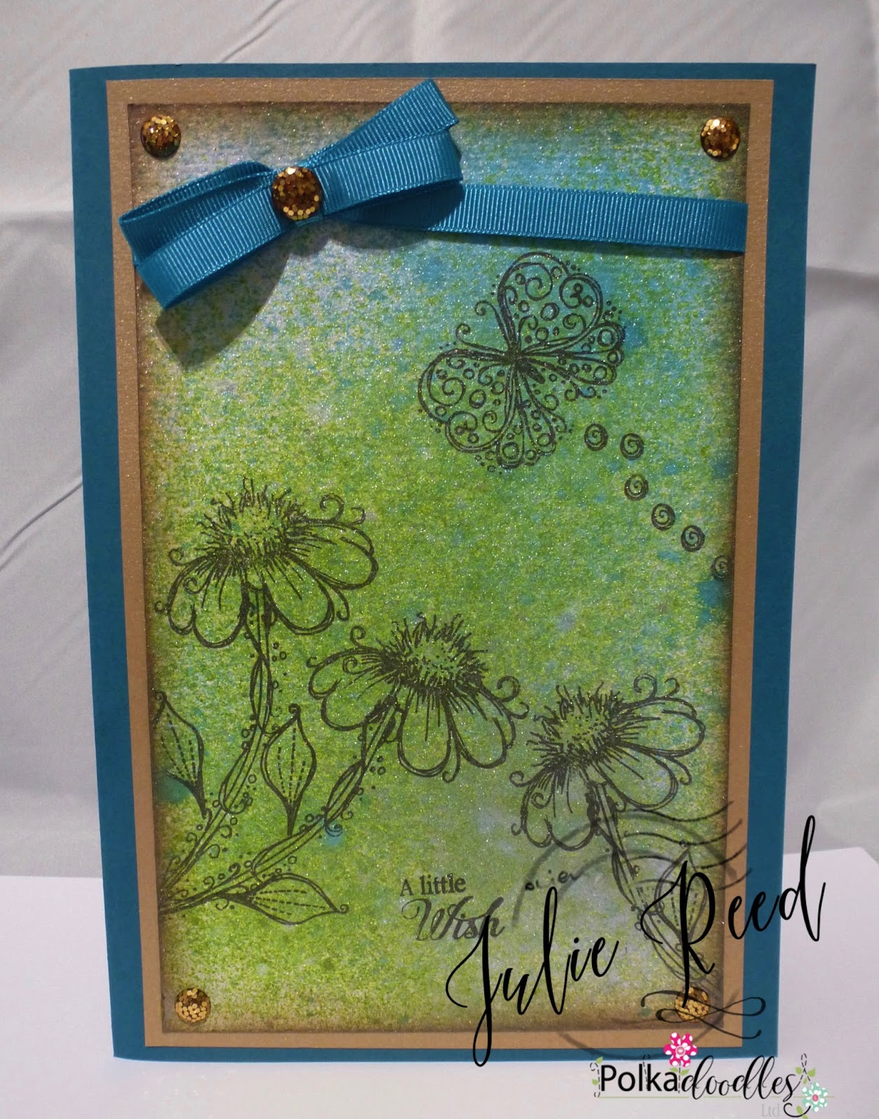 Julie - At last some Sunshine, it's lovely seeing all my Garden in Bloom, todays card is very simple and created using the fab Daisy Days Stamps and some spray inks in Turquoise and Green, creating my paper 'Garden in Bloom'.