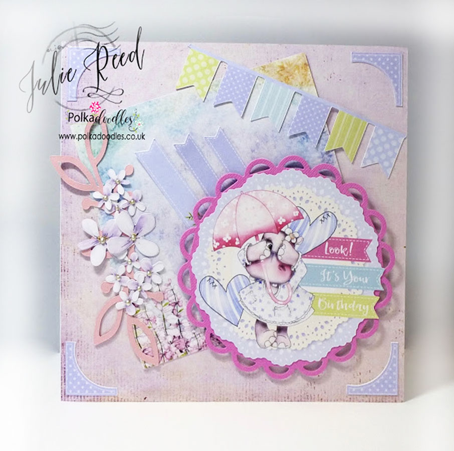 Pauline - I've used a design sheet from the Helga Hippo Download Bundle. I printed the topper a few times so that I could fussy cut her and add some decoupage layers. Everything on my card comes from Design Sheet 9 including the sentiment tag, bunting and flowers, all I have added is a little piece of ribbon, some twine and lots of gems.