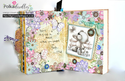 Katrina ~ I love to journal! It's such a fun way to express myself and put down what's on my mind. The flowers theme for the DT gave me a wonderful way to use all the flowers from the Winston Design Sheets. This precious gardening bear is just too perfect with this quote!