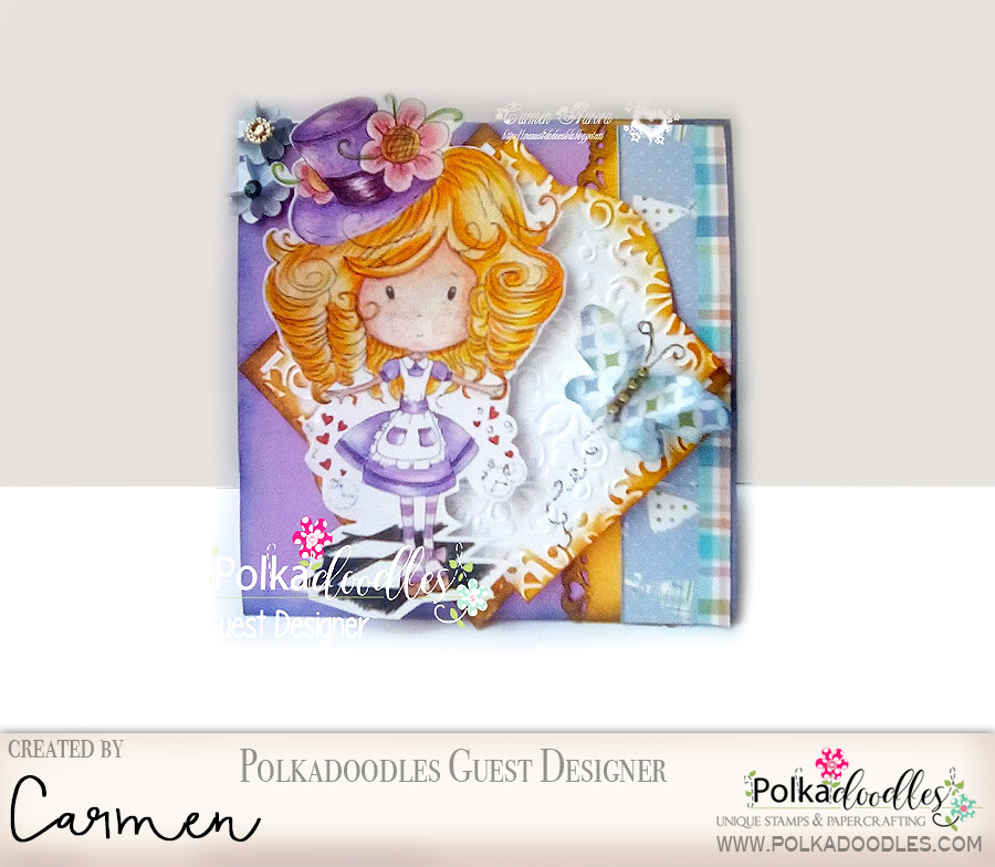 Yvonne - I used one of the gorgeous 'Darling Buds' Collection from Polkadoodles. You can get the entire collection here, or for the image I have used today, you can get 'Tulip' here. I made a 7x7 card and used a delicate paper from the Lil Miss Sugarpops Collection 2, which you can get here. I embossed a piece of plain linen card with a butterfly folder I had lurking in my stash. Details on my blog.