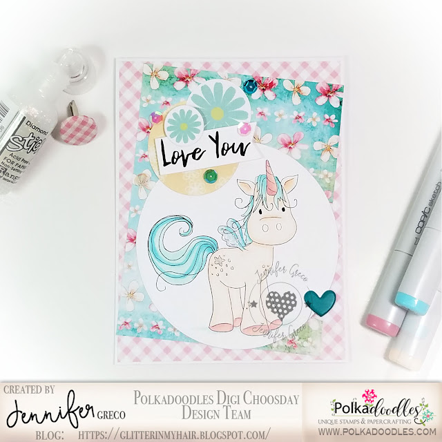 Jane S - A simple card from me today with a bold, watercoloured background and the stunning digi Oddella Heart.Jennifer - Another fun Valentine/Love theme card featuring the Too Cute line - this time it's Be A Fluffy Unicorn! Sentiment is from Winnie Celebrations 3 sentiment bundle, Flowers are from Dandelions design sheet, papers are from Helga paper heaven 2, Tatty Twinkles Easter, and Winnie Sugar Sprinkles paper heaven 4.