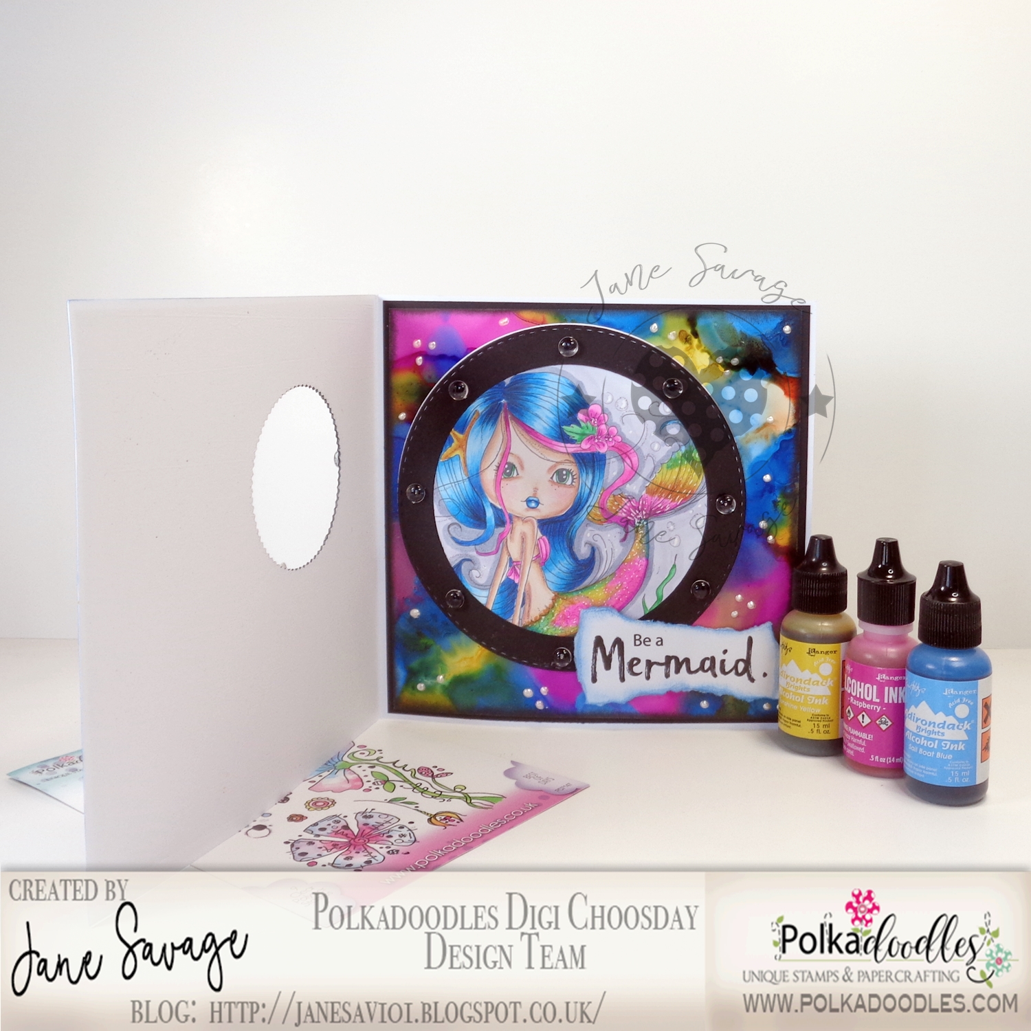 Jane S - One thing guaranteed to bring a little sunshine into my life is colour...and lots of it. So this week I have used watercolours, Copics and bottled alcohol inks to add a rainbow to my card. The image is the stunning Meribelle Swishy Tail and I cropped the image to place her inside but also added a smaller aperture in the front so you can see her peeping through. The gorgeous stamps are from the Best of Days Set and the sentiment comes from the Ula's Life Collection.